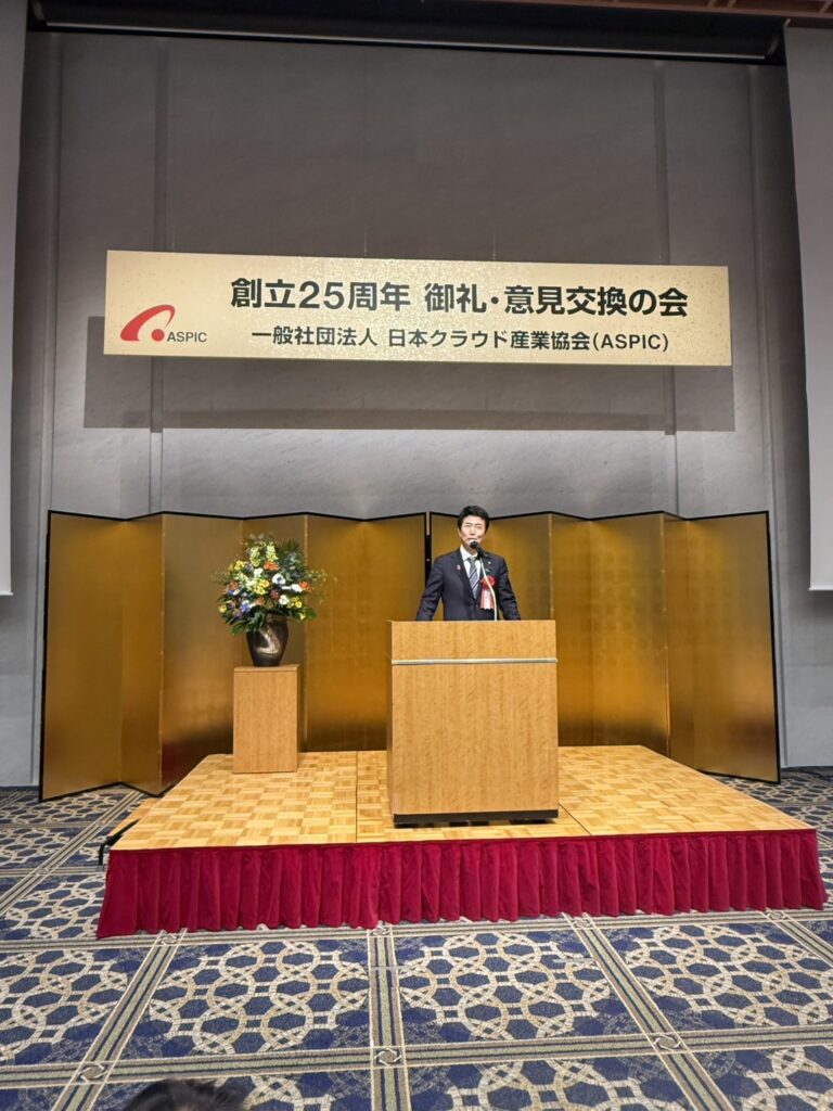 日本クラウド産業協会(ASPIC)25周年御礼・意見交換会 2025年11月19日 最終更新日時 : 2025年11月19日 周作犬童 11月19日、一般社団法人 日本クラウド産業協会(ASPIC)25周年御礼・意見交換会の会に出席させていただき、祝辞を申し上げるとともに、皆さまと意見交換いたしました。 FacebookXBlueskyHatena