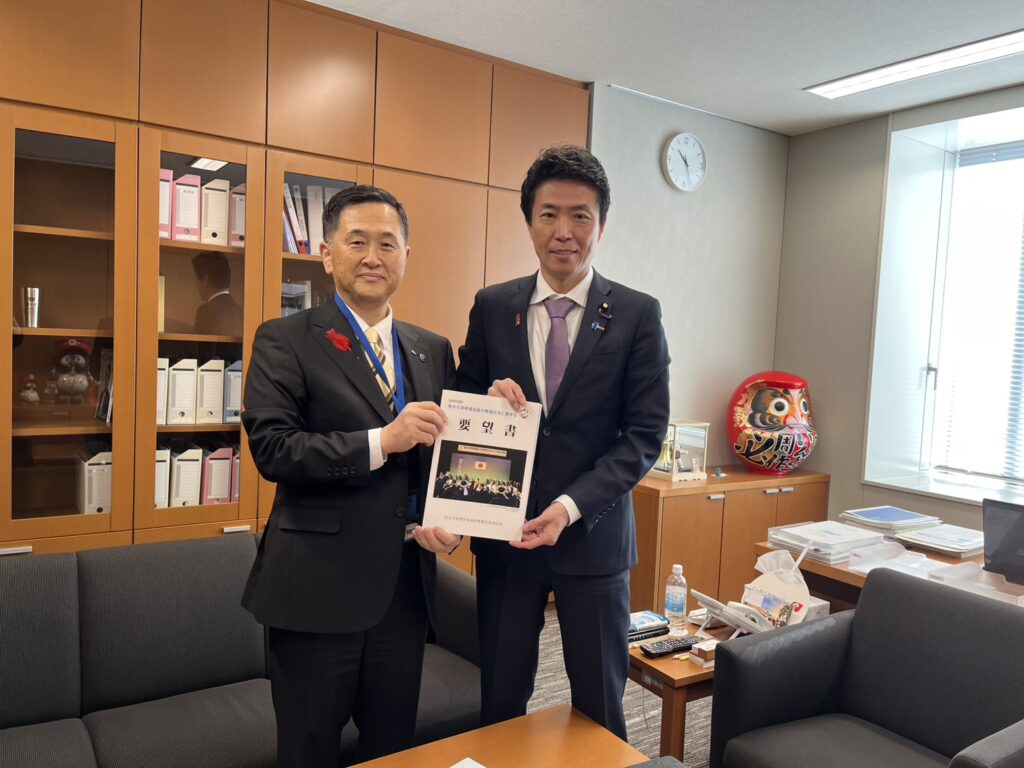 事務所訪問 2025年11月27日 最終更新日時 : 2025年11月27日 周作犬童 11月27日、熊本県天草市長の馬場 昭治様が事務所へ訪問され、熊本天草幹線道路の整備促進に関する『要望書』をいただきました。いただいた陳情書の実現に向け、尽力してまいる所存です。 FacebookXBlueskyHatena